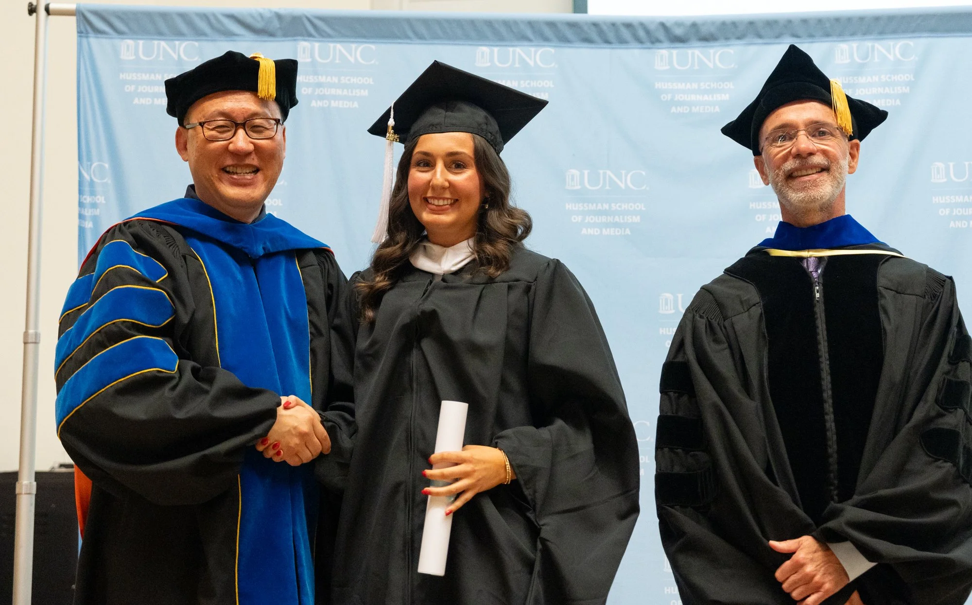 When UNC Hussman hosted its first master’s graduation celebration on Saturday, July 19, the focus was on recognizing the achievement of 21 master’s students who completed their capstone projects over the summer. For the school’s graduate administrators, faculty and staff, the event marked another milestone, the final step in the transition to one-year program formats for the strategic communication and journalism areas of study.